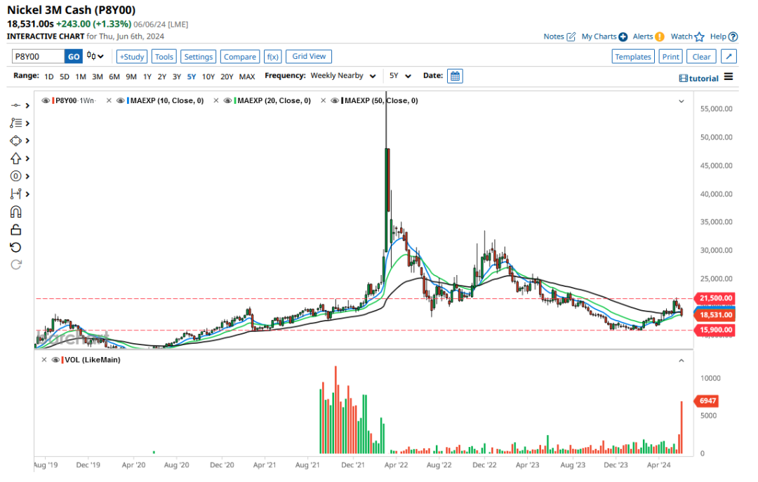 鎳在15900點(diǎn)有牢固的支撐,在21500點(diǎn)有很強(qiáng)的阻力。