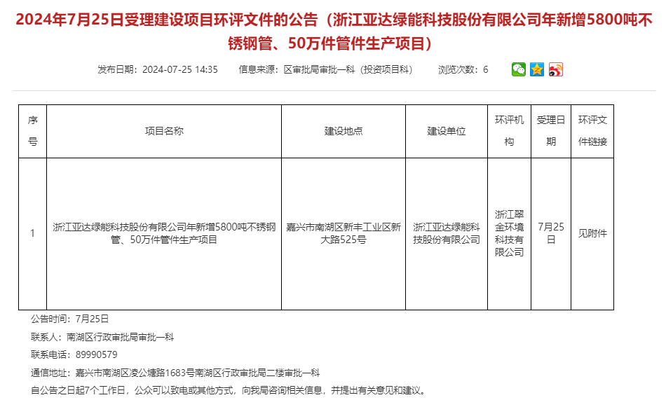 7月25日,浙江亞達(dá)綠能科技股份有限公司年新增5800噸不銹鋼管、50萬(wàn)件管件生產(chǎn)項(xiàng)目環(huán)評(píng)文件獲受理,公告期:7個(gè)工作日。