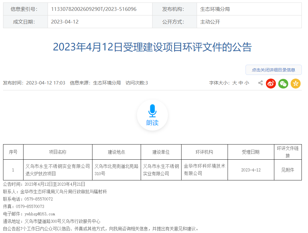 4月12日,金華市生態(tài)環(huán)境局義烏分局受理義烏市永生不銹鋼實業(yè)有限公司退火爐技改項目環(huán)境影響評價報告表并對外進行公告,公告期:7個工作日。